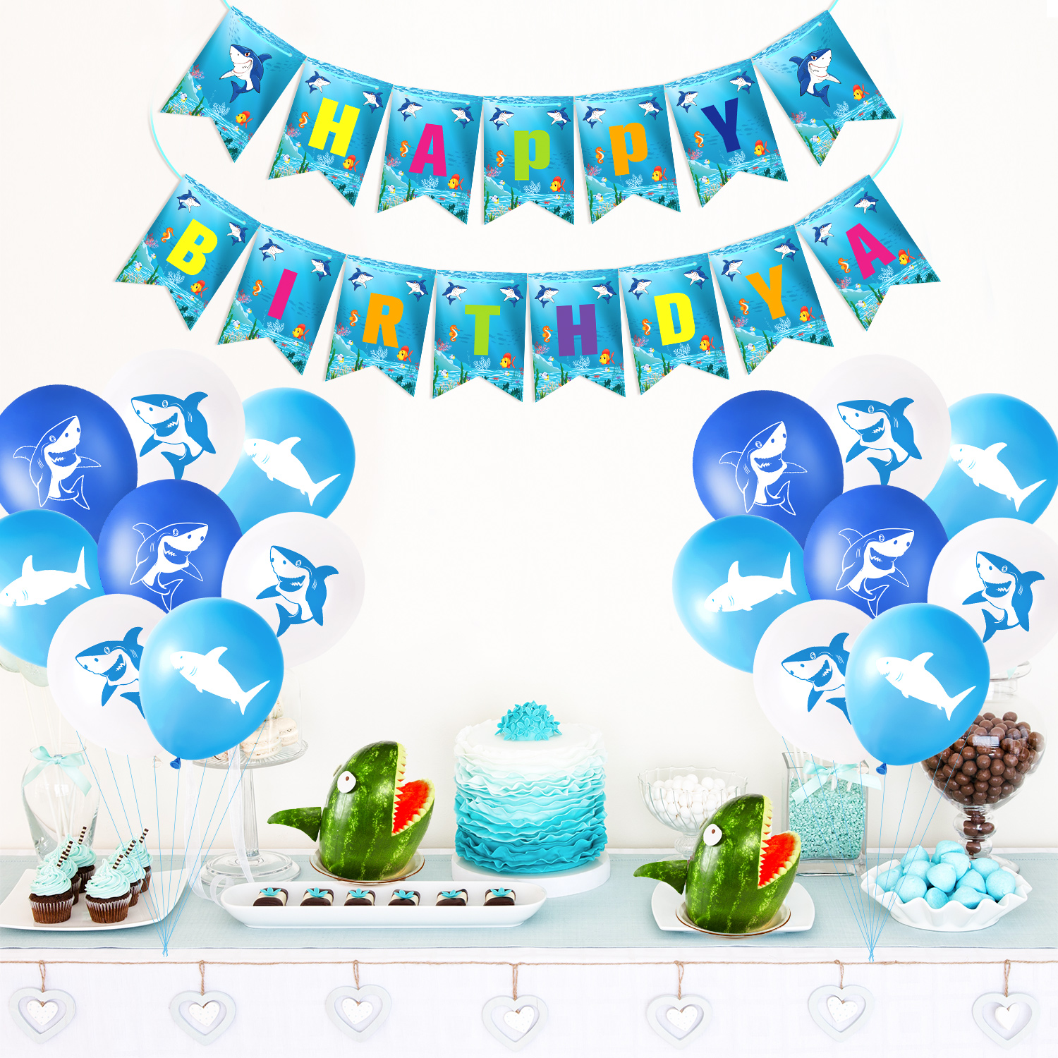 The product is designed for decorating shark theme birthday party