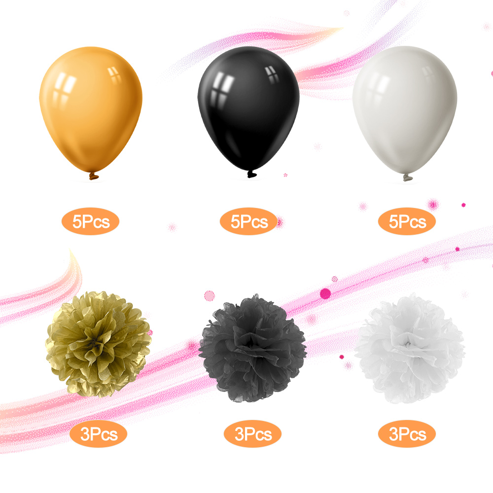 • Package included: 1* graduation party banner; 9* paper pom flowers; 15* party balloons (black, gold, white)